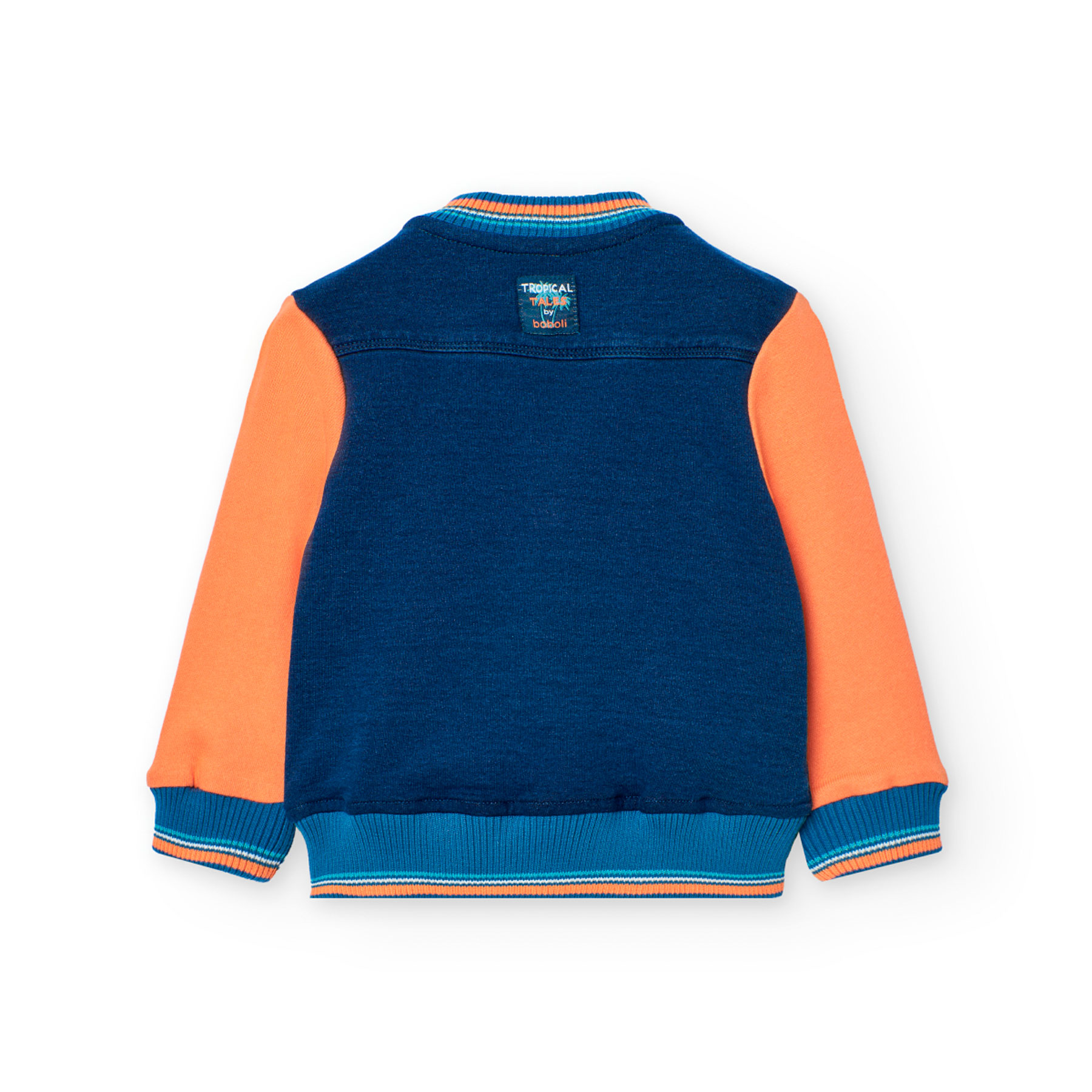 Sportovní styl s letním nádechem – ideální pro malé dobrodruhy. Stylová chlapecká bunda ve vysokoškolském stylu od značky BOBOLI. Modré tělo bundy doplňují kontrastní oranžové rukávy a pruhované lemy, které dodávají sportovní vzhled. Na hrudi je výrazná nášivka s motivem „Tropical Sunset“, evokující letní atmosféru. Ideální pro jarní a chladnější letní večery.