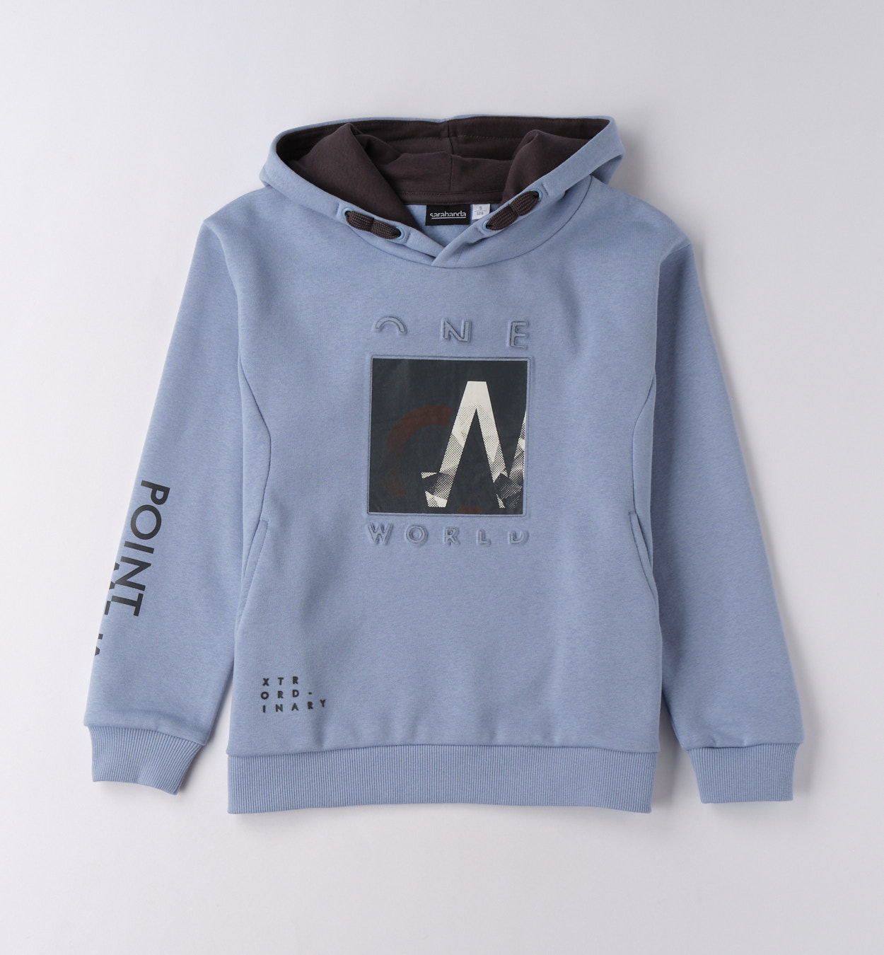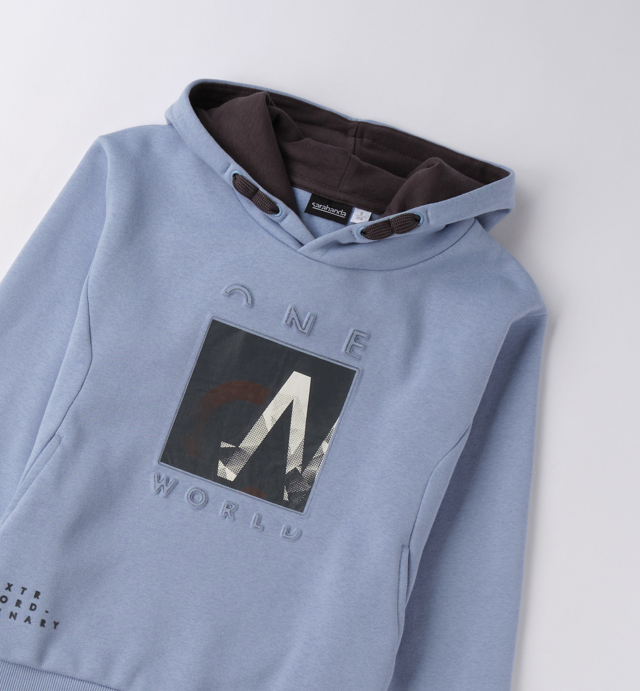 Moderní mikina s kontrastní kapucí. Modrá mikina s kapucí a potiskem „One World“ doplněným grafickými prvky. Kontrastní tmavá podšívka kapuce dodává zajímavý efekt. Praktický střih s klokaní kapsou dělá z tohoto kousku ideální volbu pro školu i volný čas.