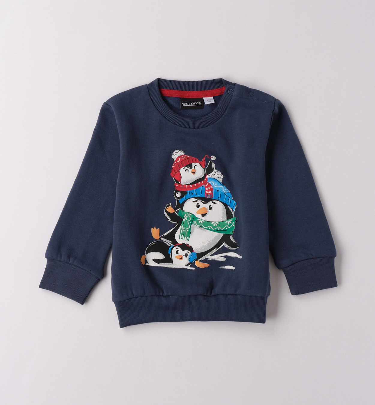 Mikina plná zimní radosti. Tmavě modrá mikina s dlouhým rukávem a potiskem veselých tučňáků na sněhu. Kontrastní barva zvýrazní motiv a dodá styl. Skvělý kousek na zimní procházky i každodenní nošení.