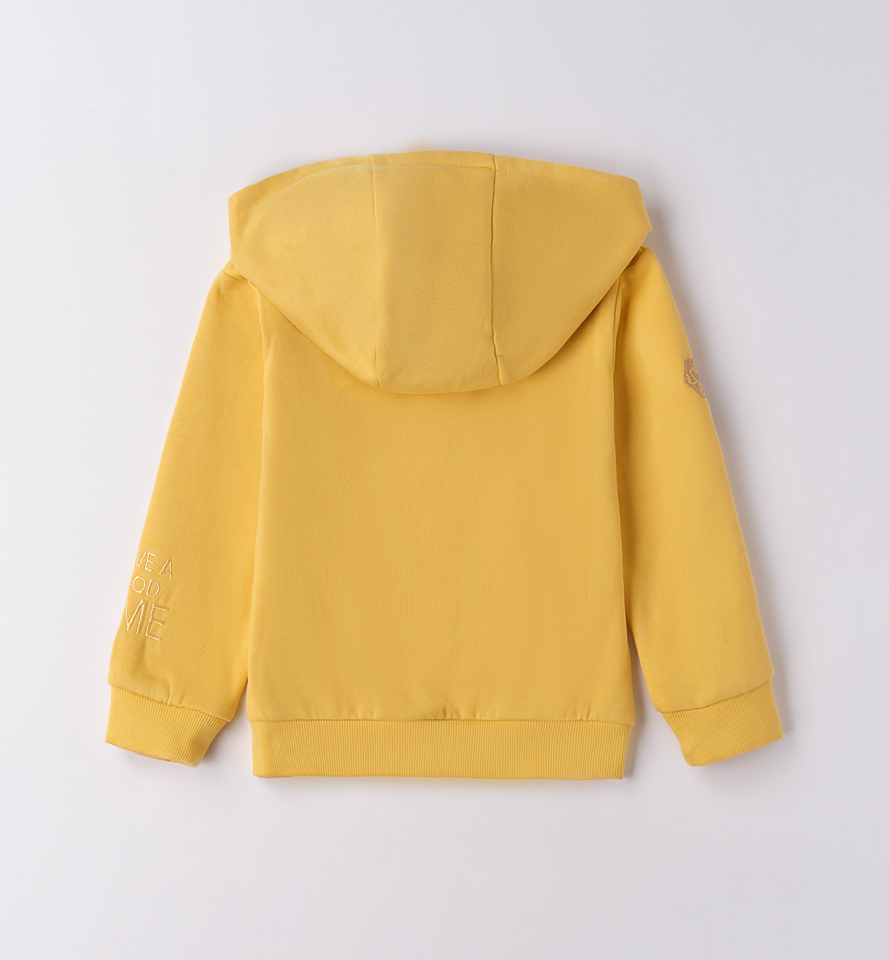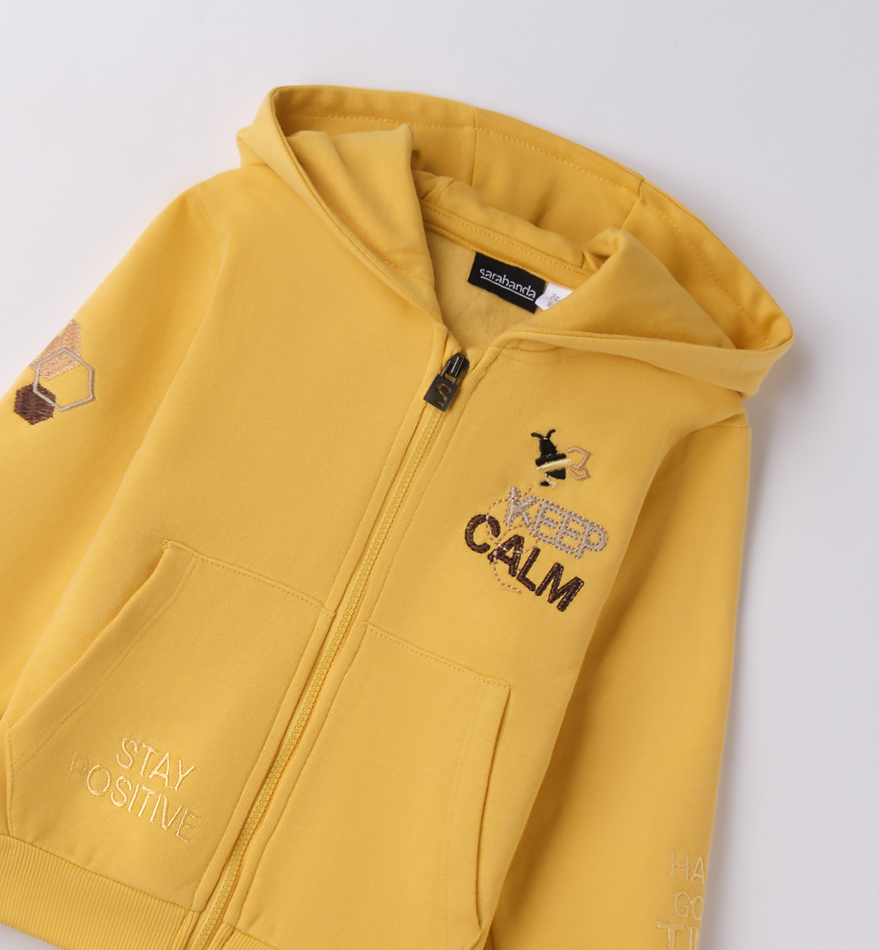 Energetická mikina s pozitivním poselstvím. Žlutá mikina na zip s kapucí a kapsami, ozdobená výraznými nápisy „Keep Calm“ a „Stay Positive“. Barevný detail na rukávech oživí outfit, zatímco pohodlný střih zajistí volnost pohybu. Perfektní volba pro aktivní kluky.