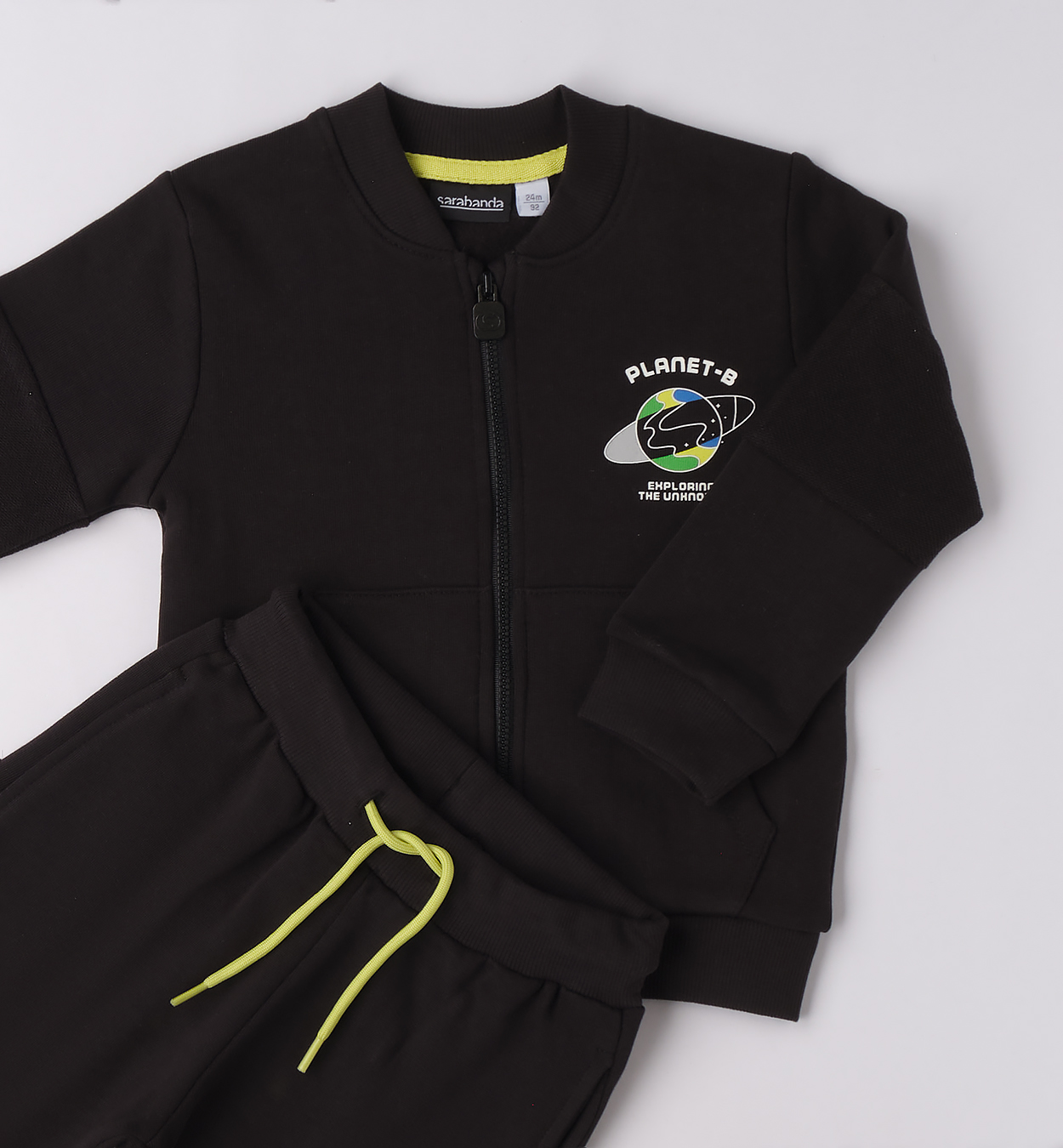 Vesmírný komplet pro malé objevitele. Černá tepláková souprava s výrazným vesmírným motivem na zádech a nápisem „PLANET-B“ vpředu. Mikina se zapínáním na zip a kapsami, kalhoty s pružným pasem a šňůrkou pro pohodlné nošení. Ideální volba pro malé milovníky planet, raket a objevování neznámého. Perfektní na každodenní nošení během chladnějších dní.