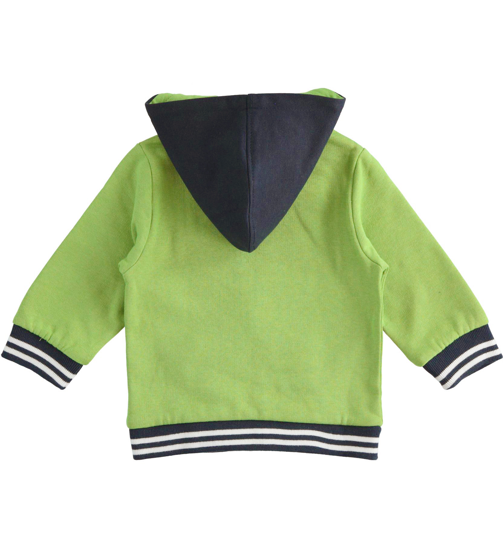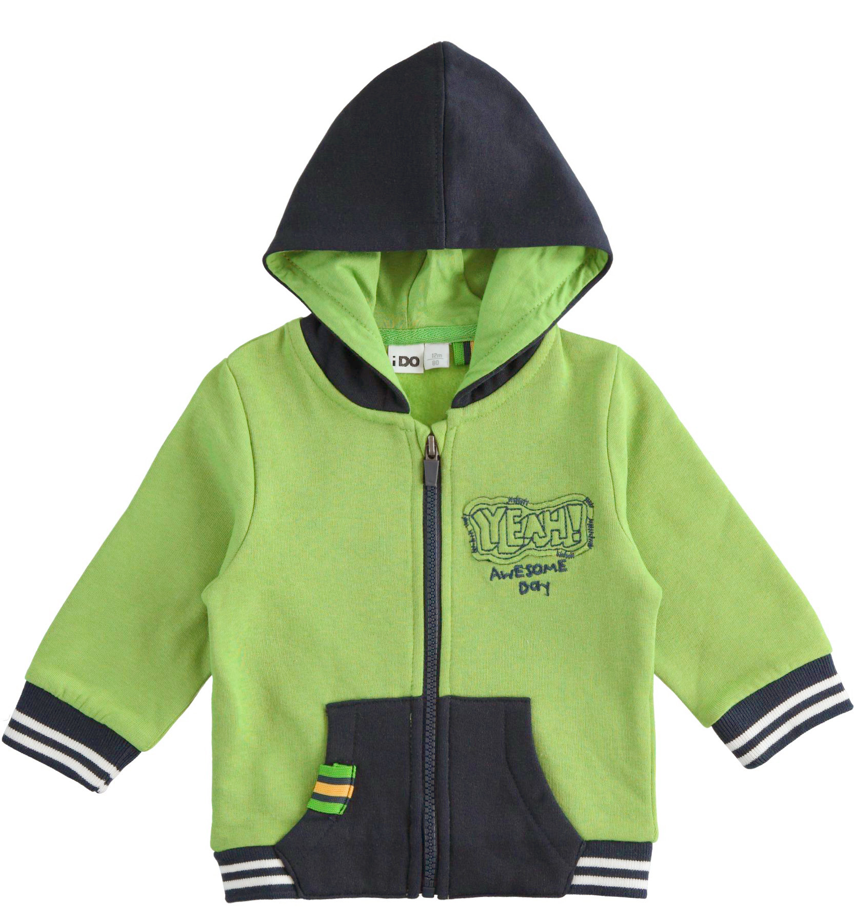 IDO children's sweatshirt made of internally brushed fabric, with winter heaviness. The model has a zip opening, hood and kangaroo pockets. The front is enriched by embroidery and application