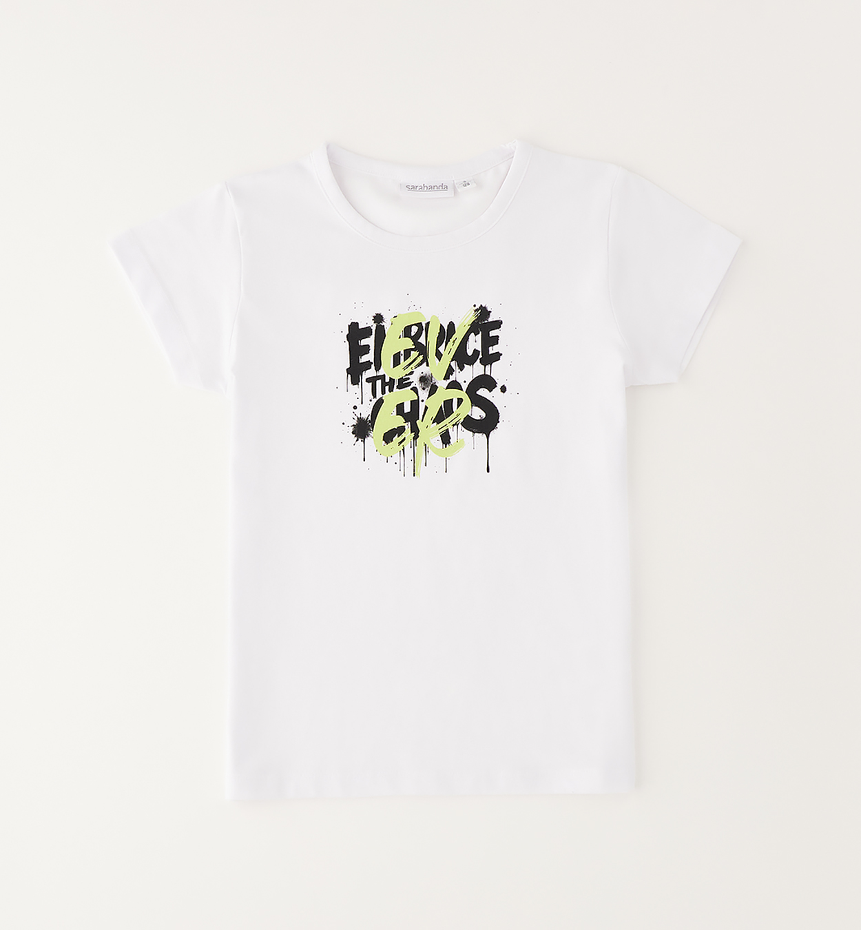 Dívčí tričko s graffiti nápisem. Bílé dívčí tričko s krátkým rukávem zdobené kontrastním graffiti nápisem v černo-neonové kombinaci. Moderní stylový kousek pro starší slečny do školy i na volný čas.