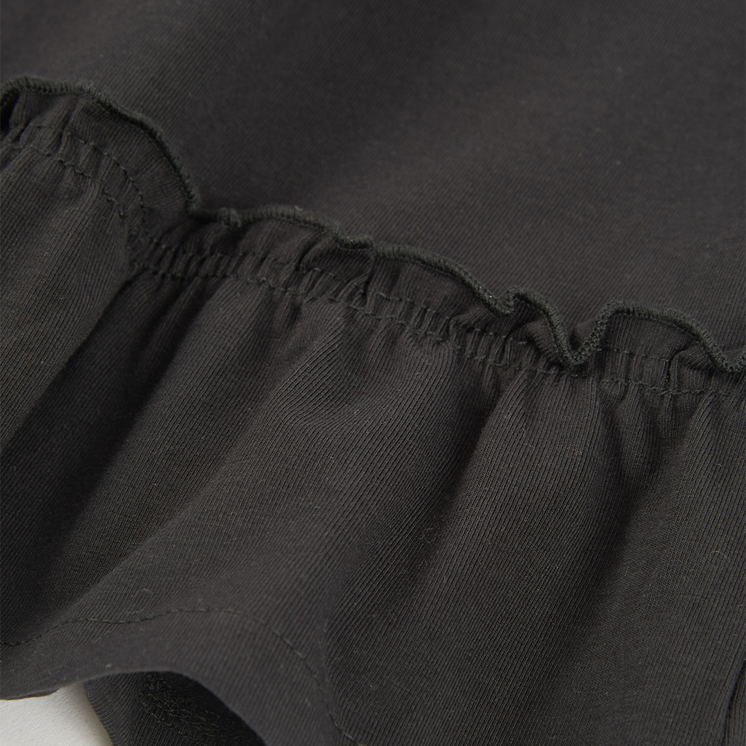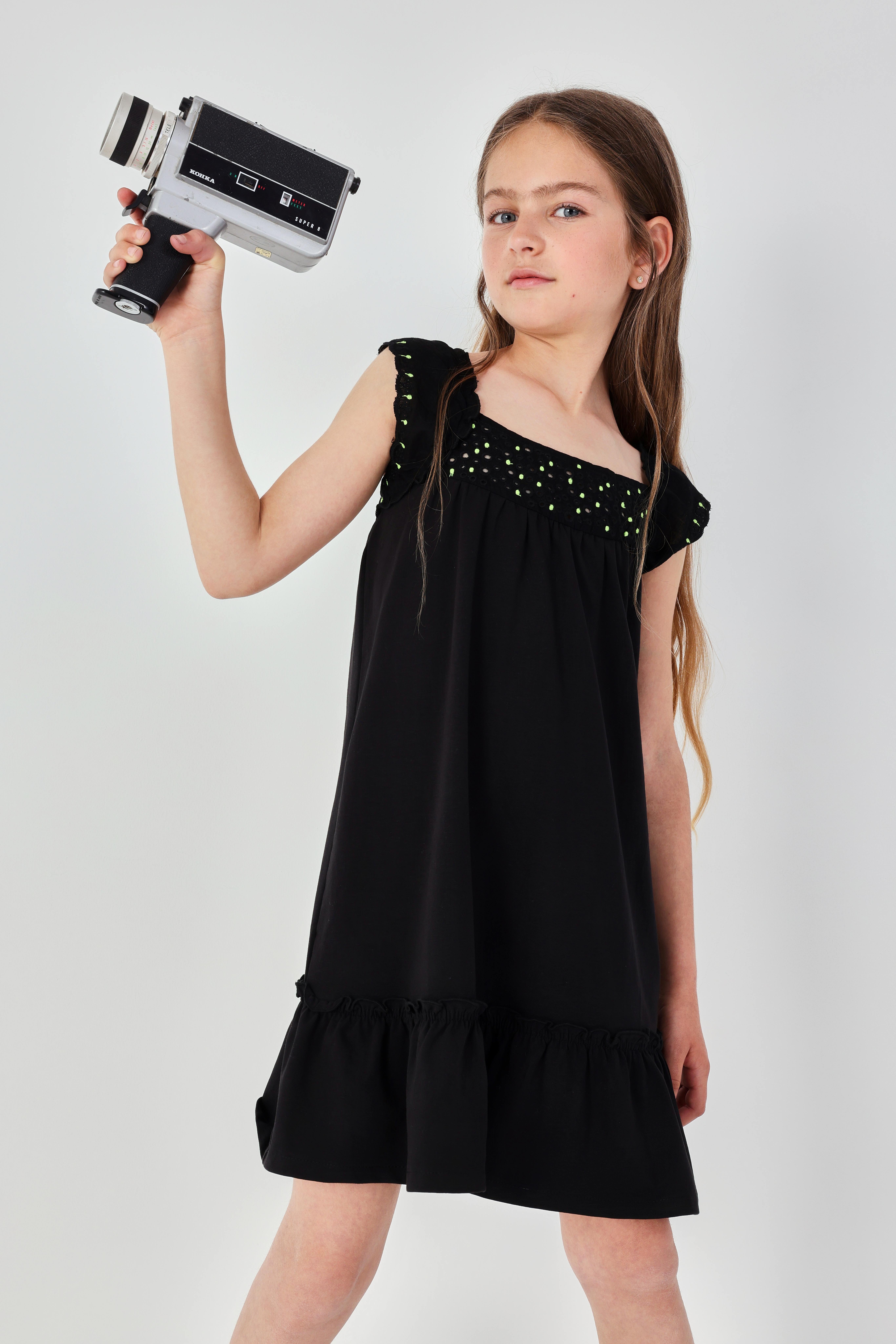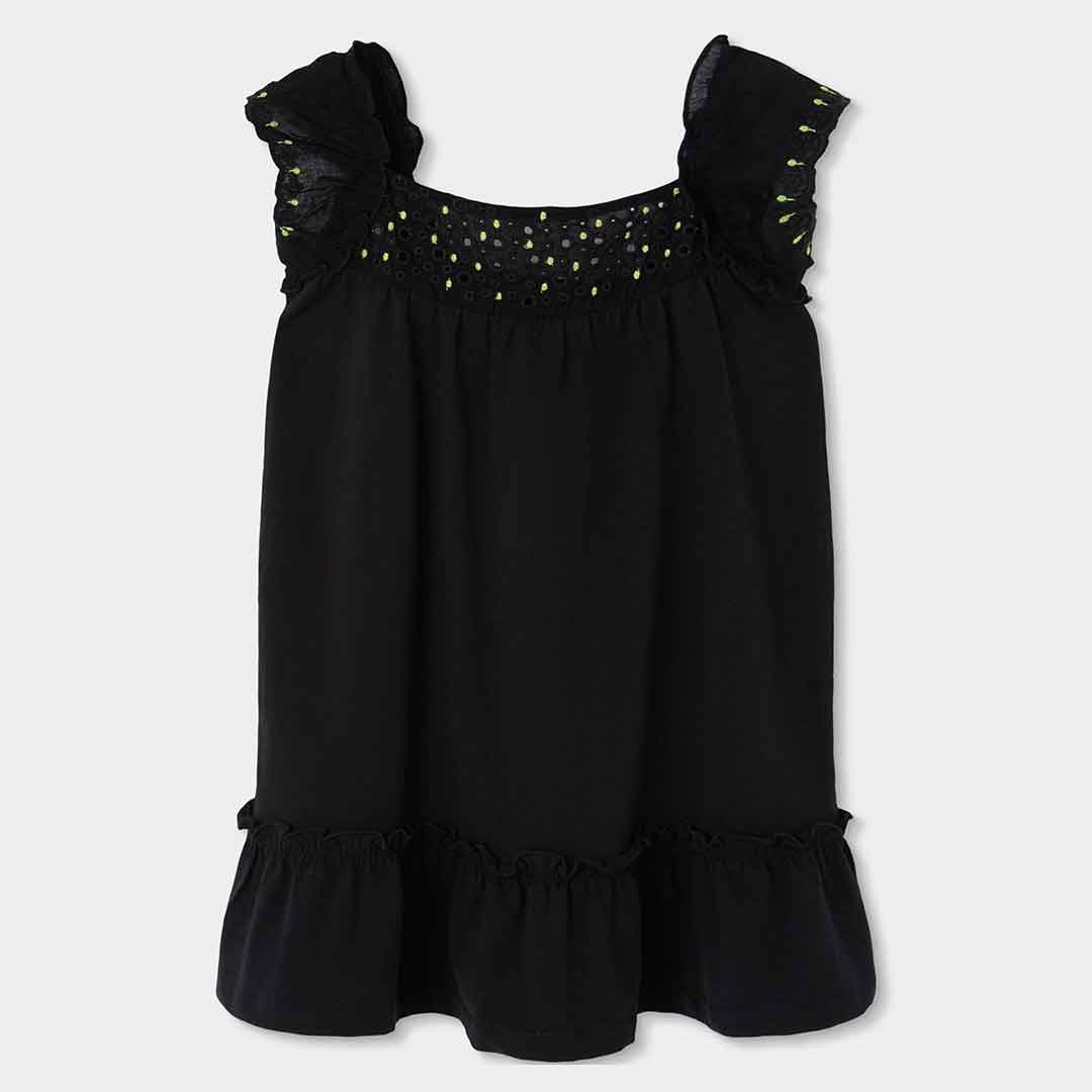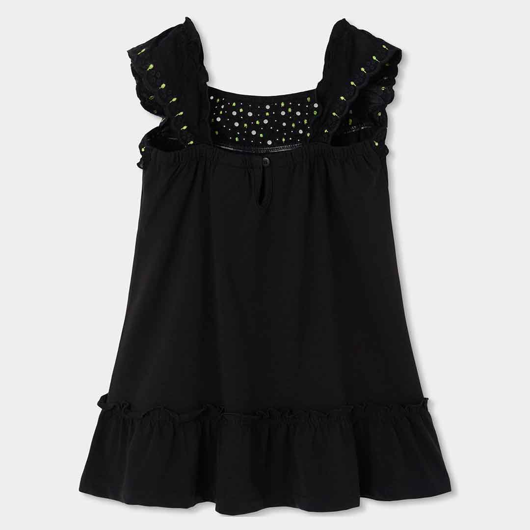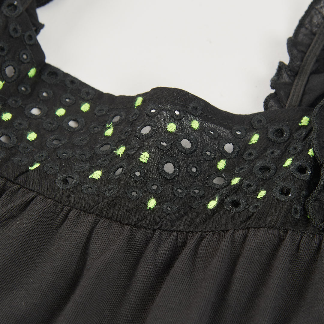 Dívčí letní šaty s volány a výšivkou. Lehké černé šaty s jemnou výšivkou u výstřihu a volánky působí elegantně, ideální na slavnostnější letní příležitosti.