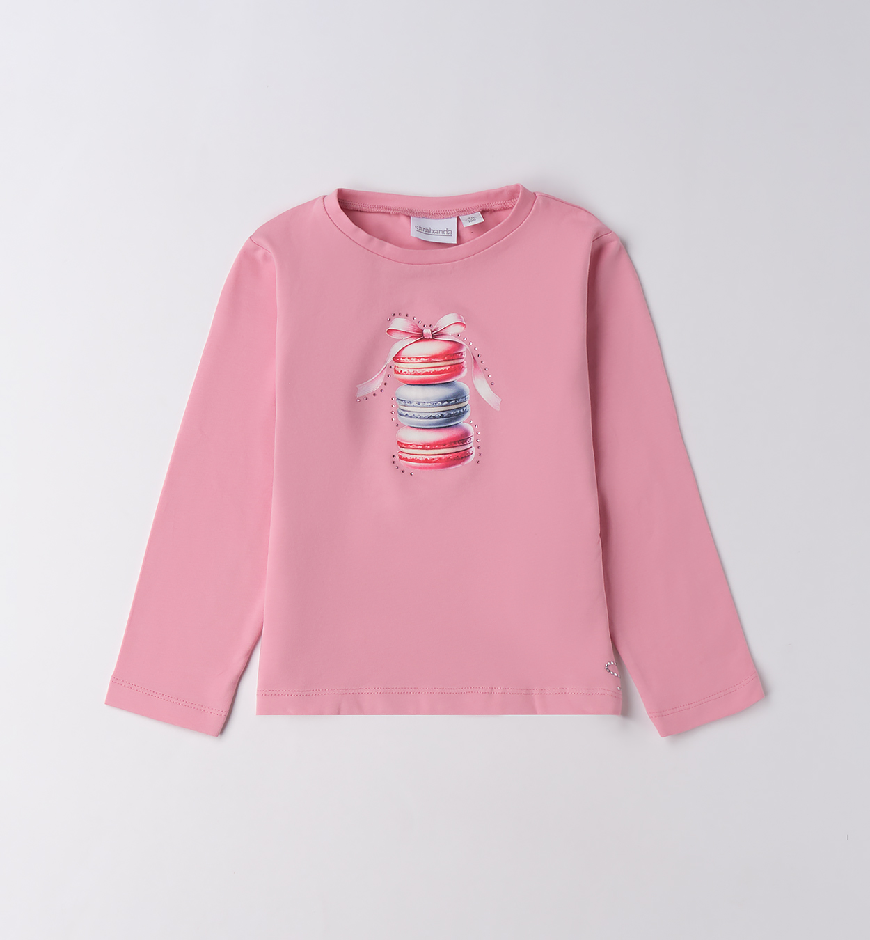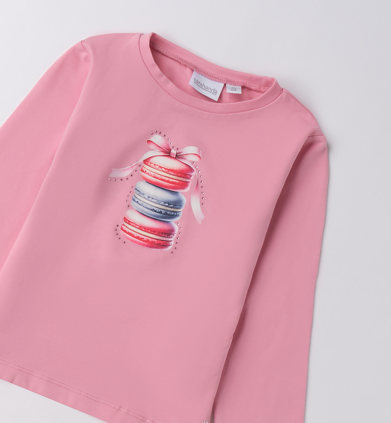 Macarons a mašlička pro malé princezny. Růžové tričko s dlouhým rukávem zdobí roztomilý potisk barevných makronek svázaných saténovou mašličkou. Jemné detaily s třpytivými kamínky dodávají elegantní vzhled. Ideální pro každodenní nošení i slavnostní chvíle.
