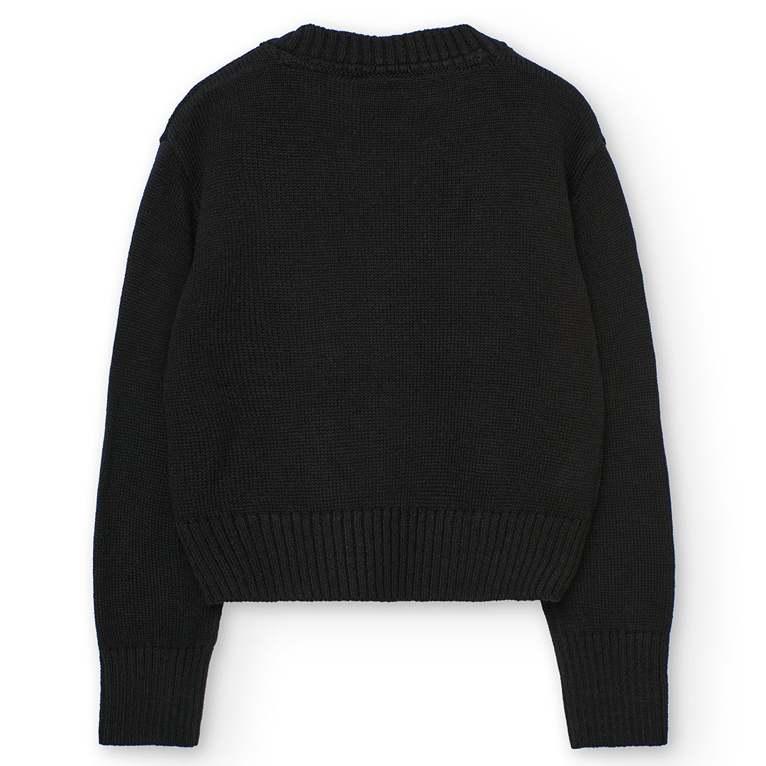 Dívčí pletený kardigan s knoflíky. Stylový černý pletený kardigan pro dívky s hlubokým výstřihem do V a zapínáním na výrazné knoflíky. Na přední straně dvě kapsy zdobené jemnými černými korálky pro decentní lesk. Ideální na kombinování s šaty i kalhotami pro podzimní a zimní outfity.